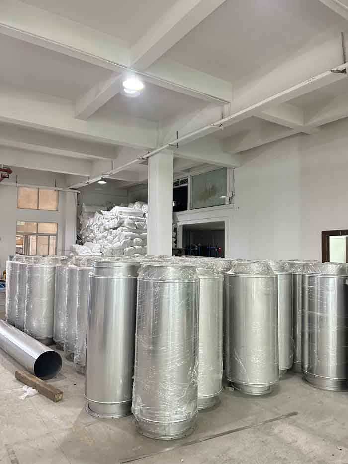 管道內(nèi)、外筒分別連接,內(nèi)筒為端部翻邊法蘭連接,外筒為端部環(huán)罩連接,設(shè)計(jì)特的連接方式使得產(chǎn)品安裝方便、快捷,無需任何焊接,與傳統(tǒng)煙囪安裝相比,可以地縮短工期,降低成本。該煙囪垂直安裝時(shí),通常為附墻直立方式,或拉線方式;水平走向是通過支吊架和建筑結(jié)合。